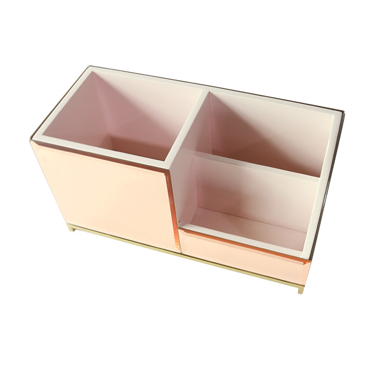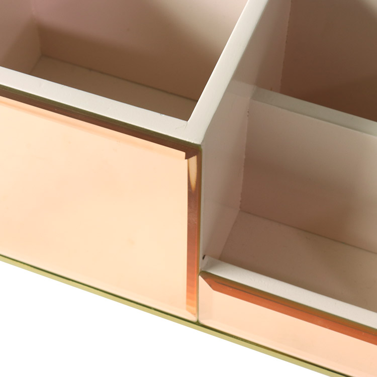 Luxury desktop organizer featuring rose gold mirror glass, painted MDF compartments, and gold metal base. Perfect for organizing makeup, stationery, and office supplies with sophisticated style.