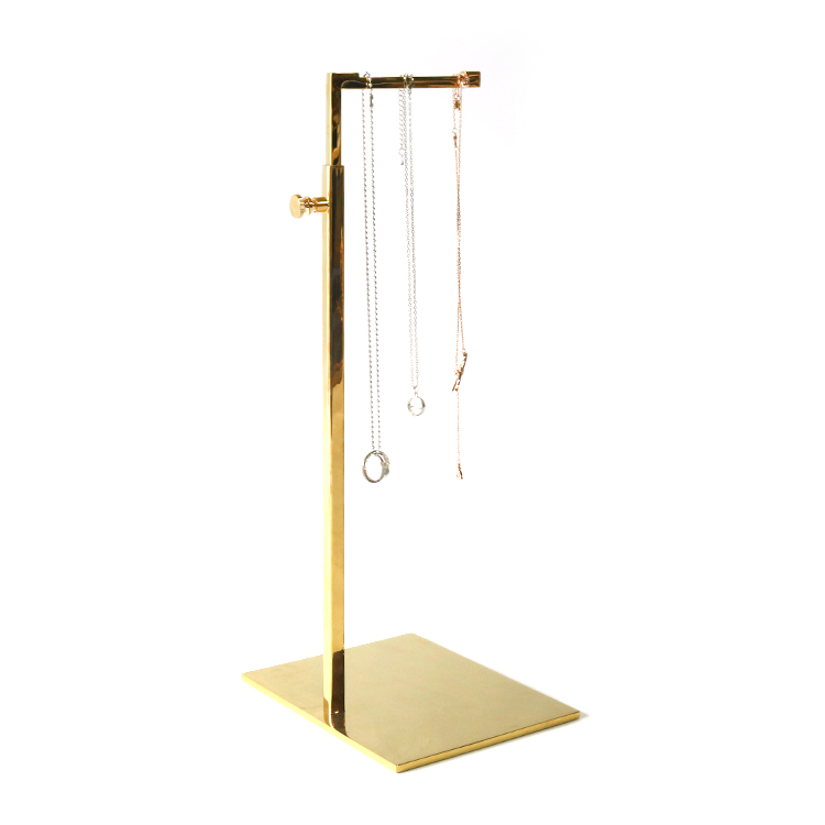 Professional metal jewelry display stand with polished gold finish, designed for secure necklace presentation in retail environments. Features adjustable height mechanism and anti-scratch felt base.