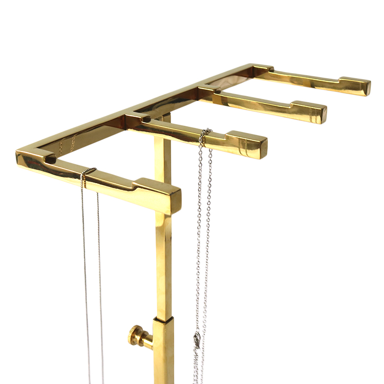 The design features a long rectangular base that ensures outstanding stability during customer interactions. A square-profile vertical column supports an adjustable hanging system with three distinct horizontal arms, allowing multiple necklaces to be displayed side-by-side without tangling.