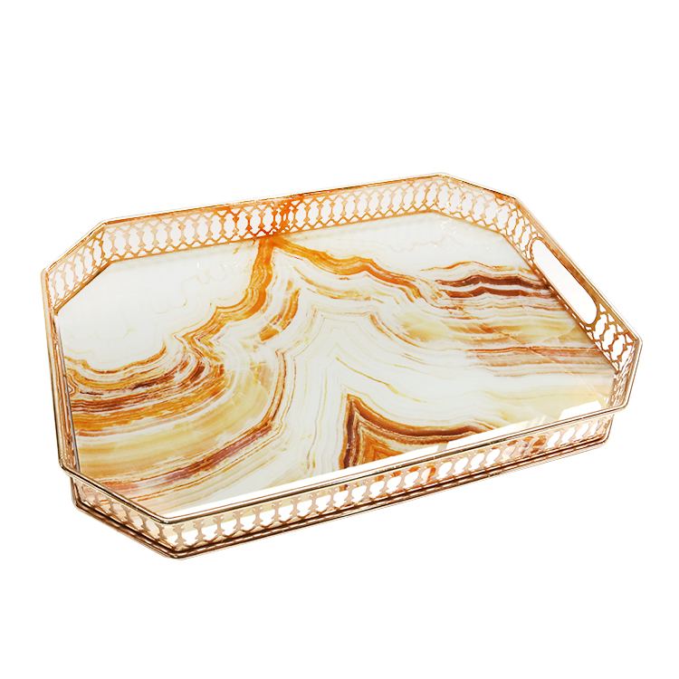 A fusion of geometric precision and organic aesthetics. This octagonal display tray features an intricate, laser-cut filigree metal border in a radiant gold finish, paired with a high-gloss amber marble-patterned base. It is a specialized solution for brands seeking to elevate tabletop presentations with a touch of classical luxury.